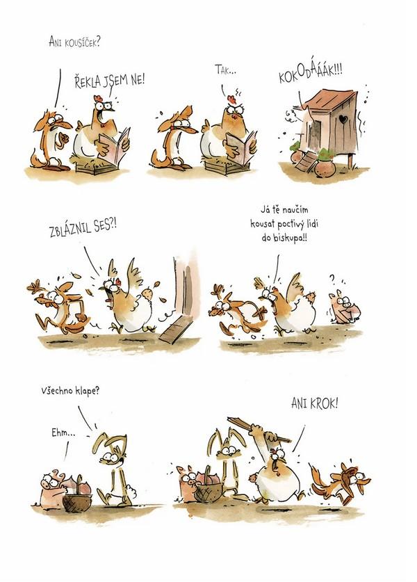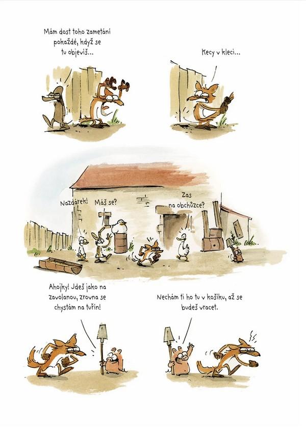 Naštěstí je tu jeho samozvaný mentor vlk. Frustrovaný a hladový lišák, přežívající jen na tuřínové dietě, se nechá přemluvit ke geniálnímu plánu, jak slepice přelstít – ukrást jim vejce, vysedět je a vykrmená kuřátka si dát k obědu. Jenže to, co v teorii zní jednoduše, se v praxi ukáže jako velká komplikace a v komiksu Benjamina Rennera také jako nesmírně vtipné dobrodružství!