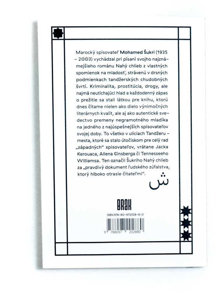 <p>To všetko v uliciach Tandžeru – mesta, ktoré sa stalo útočiskom pre celý rad „západných“ spisovateľov, vrátane Jacka Kreouaca, Allena Ginsberga či Tennesseeho Williamsa. Ten označil Šukriho Nahý chlieb za „pravdivý dokument ľudského zúfalstva, ktorý hlboko otrasie čitateľmi“.</p><img src="https://static.artforum.sk/media/redactorjs/nahz-chlieb-00.jpg"><p><img src="https://static.artforum.sk/media/redactorjs/nahz-chlieb.jpg"></p><img src="https://static.artforum.sk/media/redactorjs/nahz-chlieb-01.jpg"><p><img src="https://static.artforum.sk/media/redactorjs/nahy-chlieb-01.jpg"></p>